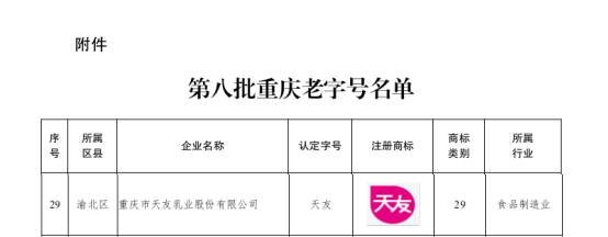 5月30日,重慶市商務(wù)委員會(huì)正式發(fā)布了《關(guān)于認(rèn)定第八批重慶老字號(hào)的通知》(渝商務(wù)〔2025〕160 號(hào)),市農(nóng)投集團(tuán)所屬天友乳業(yè)“天友”品牌位列其中。